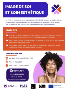 C’est dans cette dynamique que le PLIE, en partenariat avec l’association 𝗔𝗠𝗔𝗟 𝗗𝗜𝗔𝗠, organise une action autour de l’image de soi et du soin esthétique.